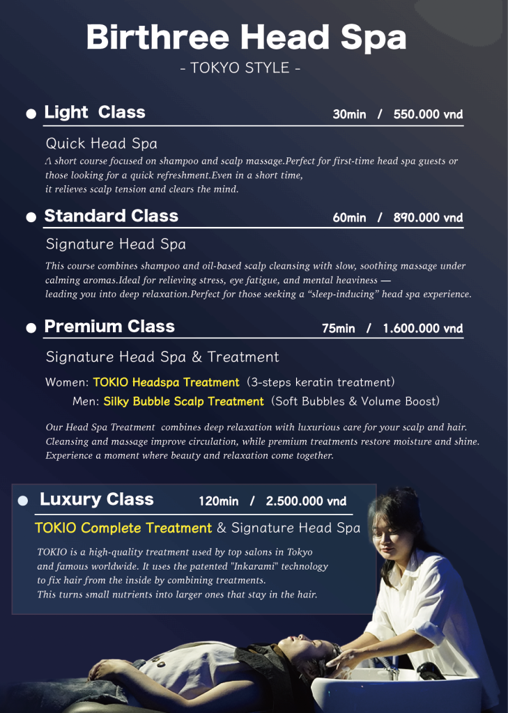 In our Head Spa & Treatment, we use Inkarami technology to penetrate and bond keratin to the hair surface, enhancing shine and manageability. This involves a three-step treatment system that combines multiple treatments to care for your hair from the inside out. Enjoy the beauty and luxury of our head spa techniques.