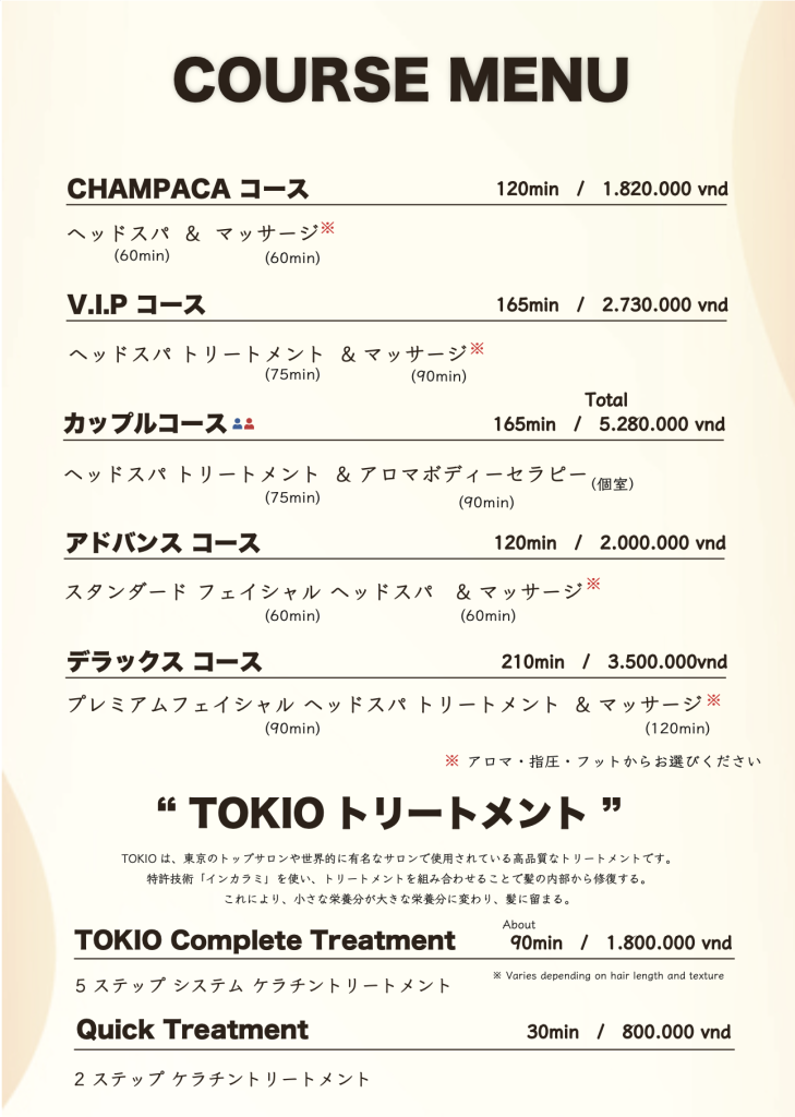 高級ブランドTOKIOのトリートメントが特別に組み 込まれ、髪質が一変する驚きの体験が待っています。 最高品質のマッサージとトリートメントの融合で、 心地よさと美しさの境地へと誘います。 最上級のおもてなしと髪質変化の奇跡を、VIPコース で感じてください。